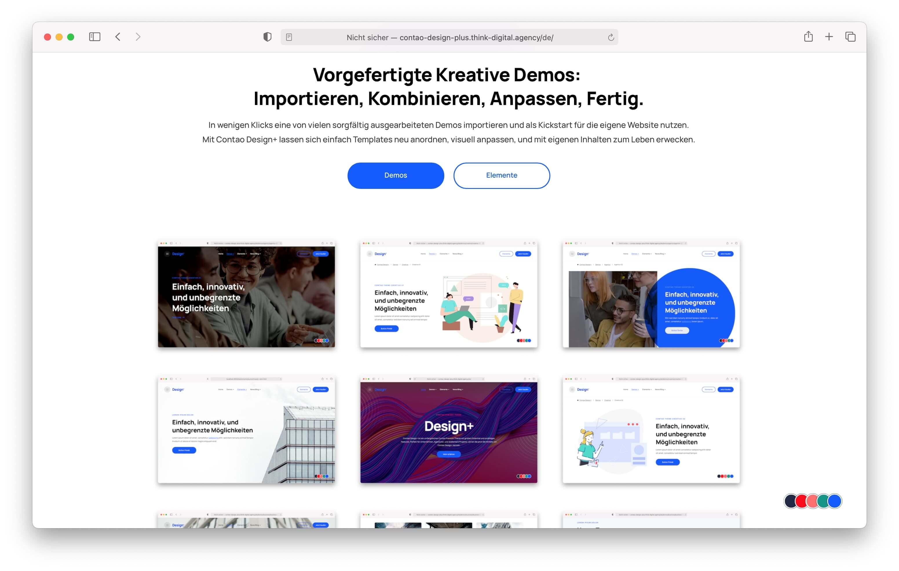 Mit Contao als intuitiver Basis ermöglicht das Theme verschiedenste Anforderungen mit Leichtigkeit und ohne Programmierkenntnisse umzusetzen. Aus einem Set von über 100 aufeinander abgestimmten Elementen können innovative Onepager oder umfangreiche Business Websites im Handumdrehen erstellt werden. Hunderte Kunden haben Contao Design+ bereits erfolgreich im Einsatz. Nutzen auch Sie jetzt die Vorteile von Contao Design+.